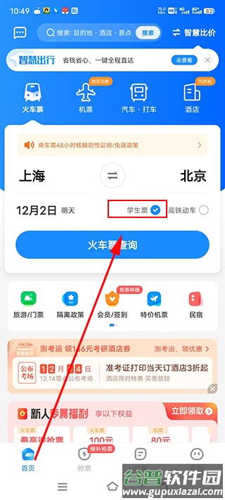 认证成功后返回主页,勾选“学生票”选项即可购买学生票。