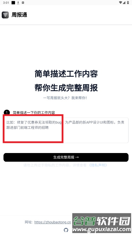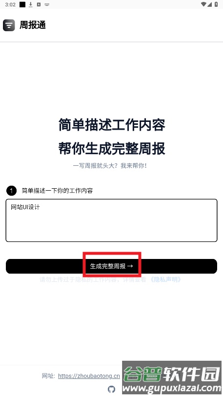 启动AI写周报工具,在输入框中简要描述你的工作,例如进行了网站界面设计;