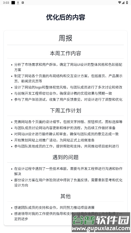 1、自动生成内容:用户输入本周重点工作、遇到的问题等关键点,软件即可依据这些信息快速生成一份结构分明、逻辑顺畅的周报初稿。