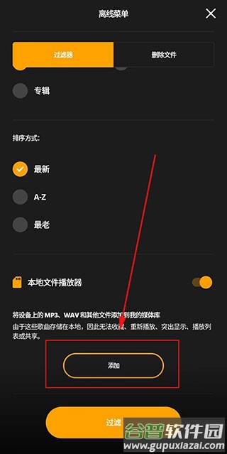 5. 打开离线菜单,在筛选器中勾选“本地文件播放器”选项,点击添加即可导入本地音乐文件。