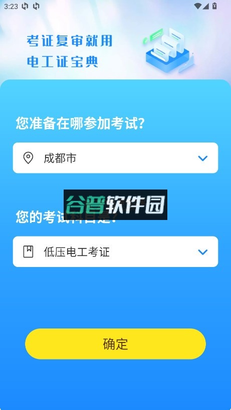 1、打开软件后,首先选择所在城市和计划报考的电工证书类型。