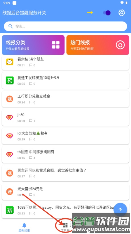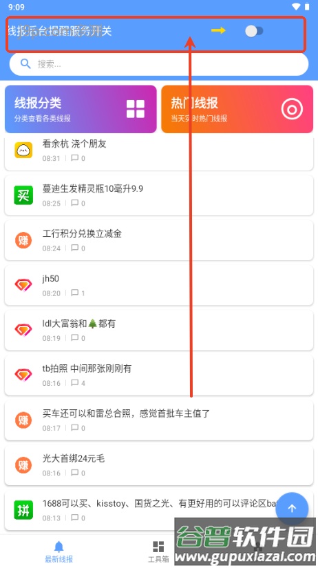 2、打开软件,在首页右上角找到线报后台提醒的服务开关;