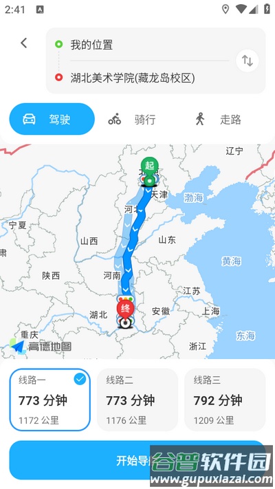 3、系统会显示多条推荐路线,选择其中一条并点击开始导航按钮;