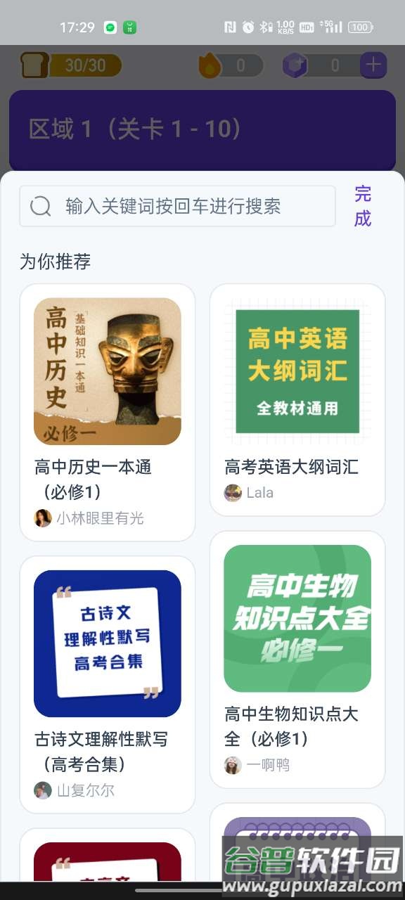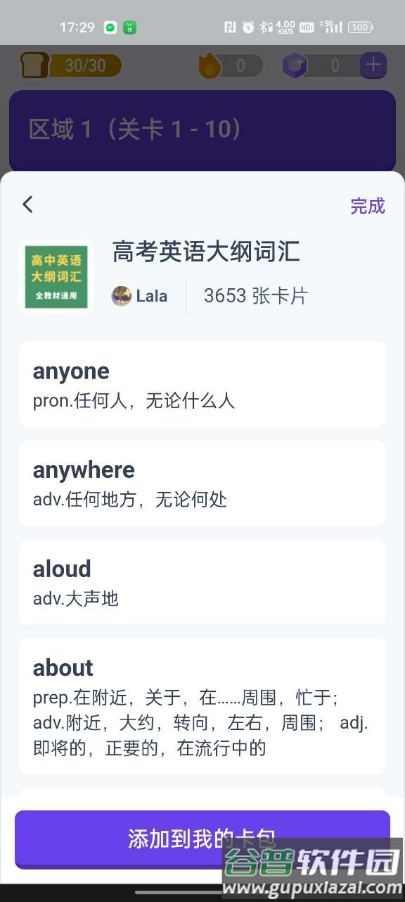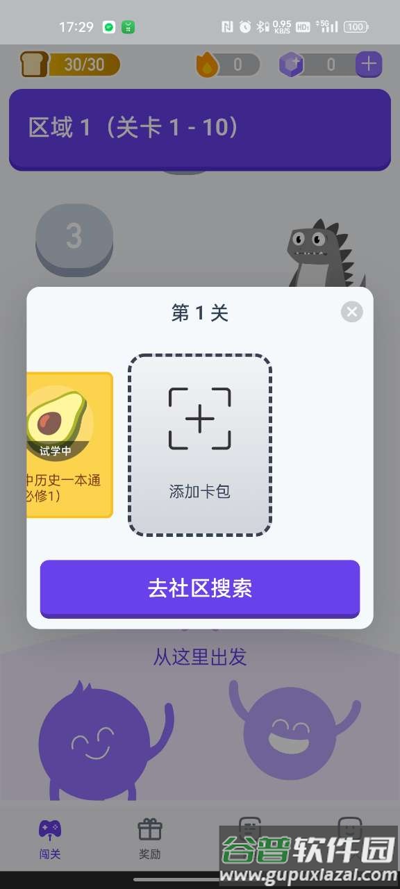 5、成功添加后,返回闯关界面并点击个人头像进入第一关;之前添加的卡包内容便会转化为一系列具体的学习关卡。