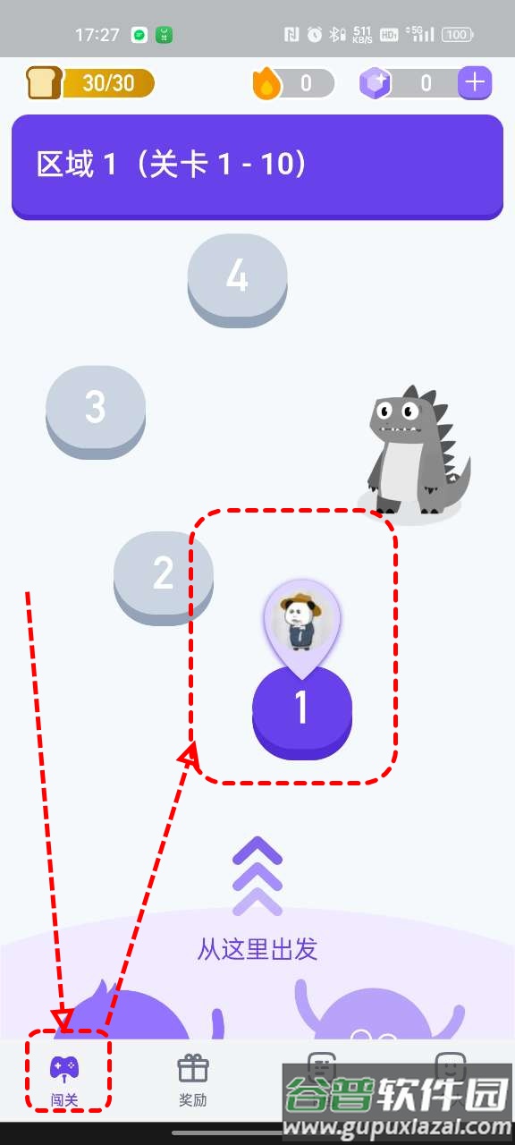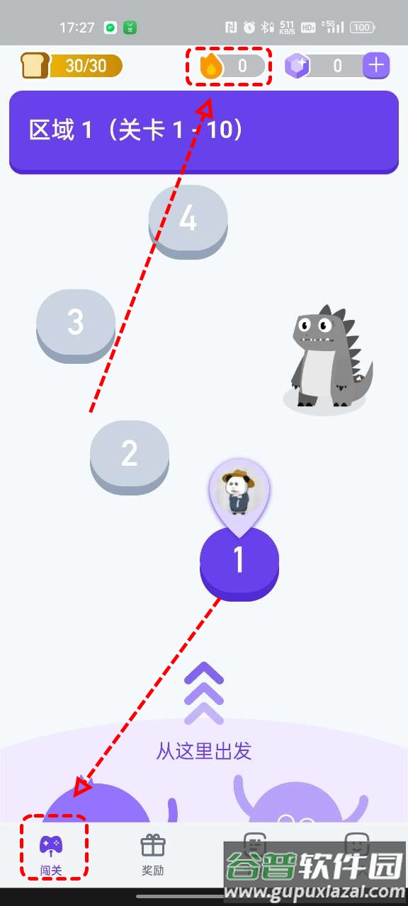 1、在本站下载安装软件,打开后进入首页闯关栏目,点击页面上方的火苗图标。
