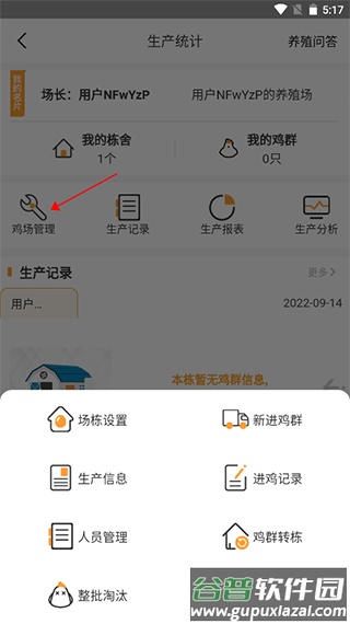 3、进入管理页面后,选择“鸡场管理”功能,即可对场栋信息、生产数据、人员配置等项目进行设置与调整。