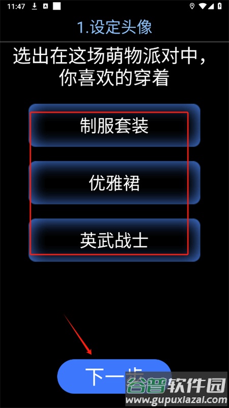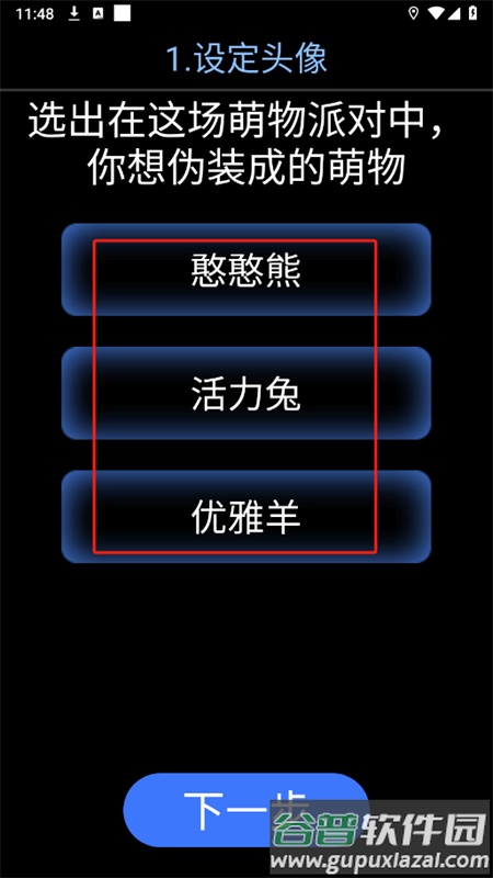 5、选出在这场派对中你想扮演的萌物形象,点击下一步。