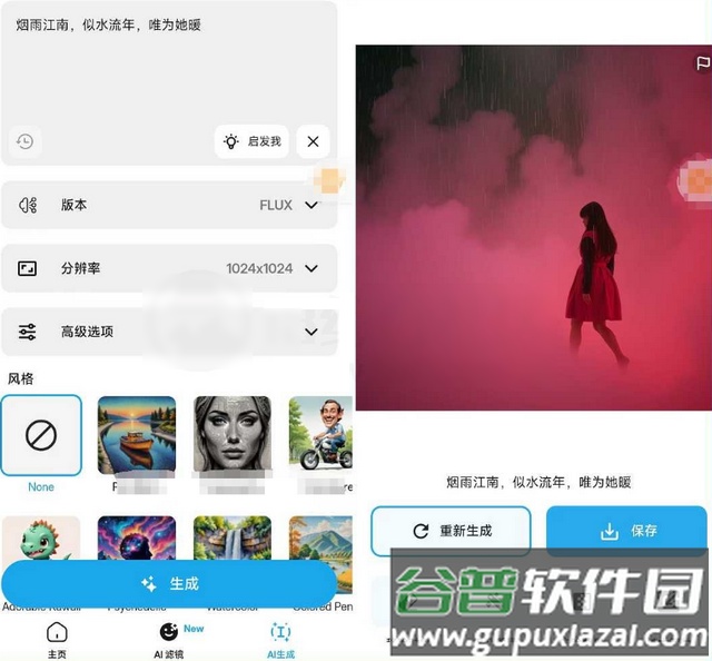 AI生成功能颇具创意,输入文字描述就能生成专属图像;例如输入“烟雨江南,似水流年,唯为她暖”,选择分辨率和风格(支持写实、二次元等多种模式),瞬间就能得到古风画面;如果不满意,可以多次重新生成,让创作变得轻松有趣。