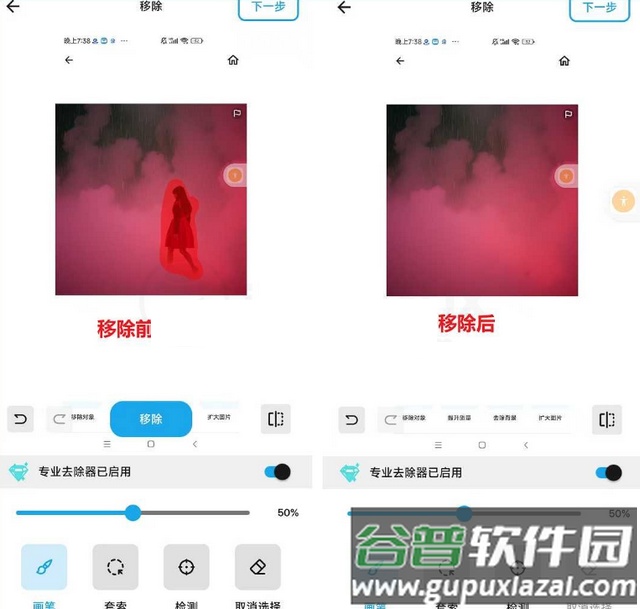 移除对象功能表现突出,堪称瑕疵清理利器;无论是路人、电线杆,还是面部的痘痘斑点,用画笔轻轻涂抹,AI便能识别并消除,同时无缝修复背景,效果细腻;实测对比图中,修改痕迹几乎无法察觉。