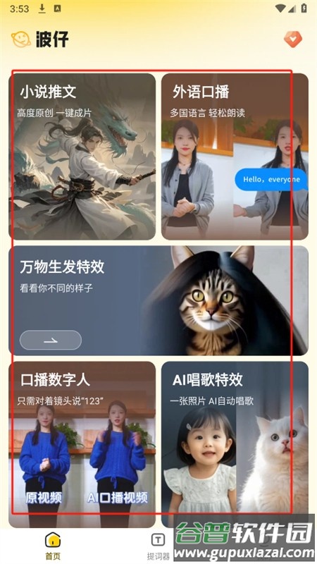 1、进入软件主页后,可以看到小说推文、外语口播、万物生发特效等多种功能入口;