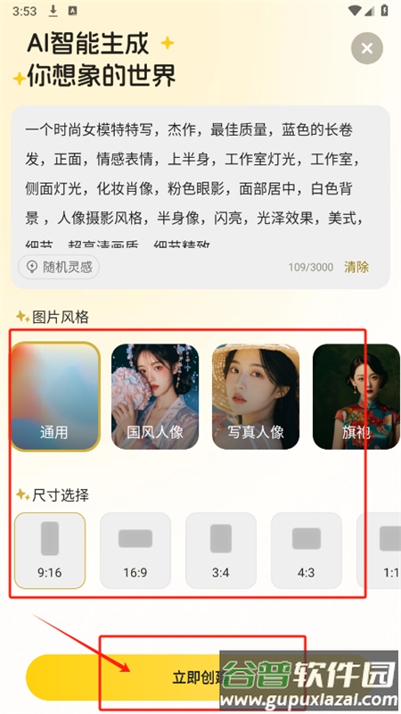 4、选择合适的图片风格与尺寸,输入具体的描述文字,点击立即创建就能得到生成的画作;