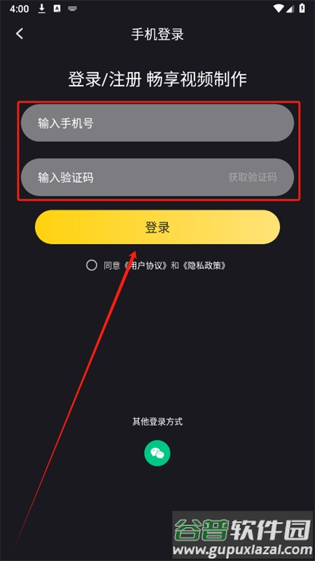 4、输入手机号码与收到的验证码,点击登录即可自动完成账号注册;