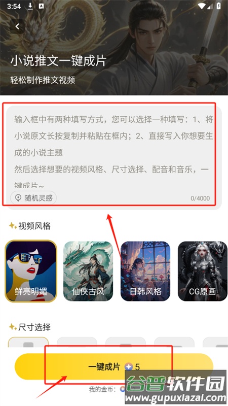 2、点击小说推文功能,输入想要的主题,挑选视频风格与画面尺寸,最后点击一键成片就能快速生成视频;