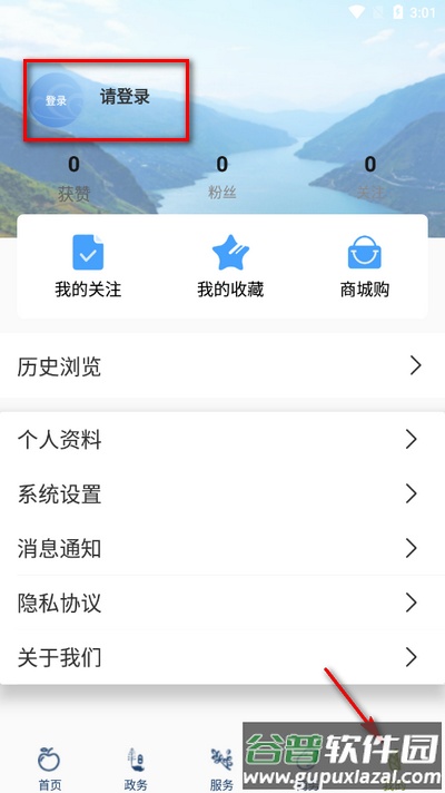 2、进入应用后,点击底部导航栏“我的”选项,随后点击页面上方的登录入口;