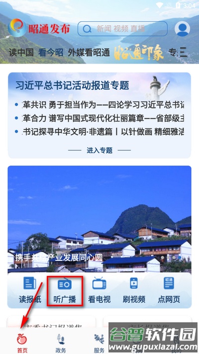 1、启动应用,在首页找到并点击“听广播”功能入口;