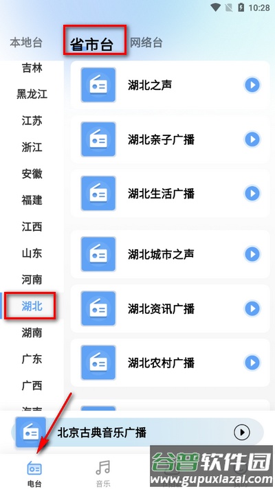 2、进入电台界面后,点击省市台选项,从中选择所属省份即可。