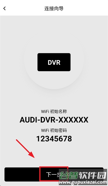 进入连接引导页面后,按提示点击下一步,系统将跳转至无线网络设置界面;找到名称为AUDI-DVR-XXXXXX的WiFi信号,输入密码12345678完成连接,随后返回奥智行应用即可正常使用。