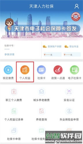 1. 登录津社保app账号后,在首页或功能菜单中找到并点击“个人权益”。