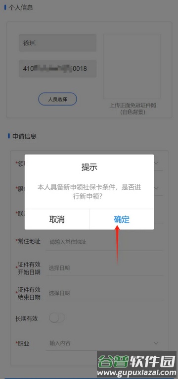 若在天津市从未申领过社保卡或当前没有有效卡片,系统会提示可进行申领,点击确定继续;如果已有社保卡且处于有效状态,需先返回完成挂失操作。