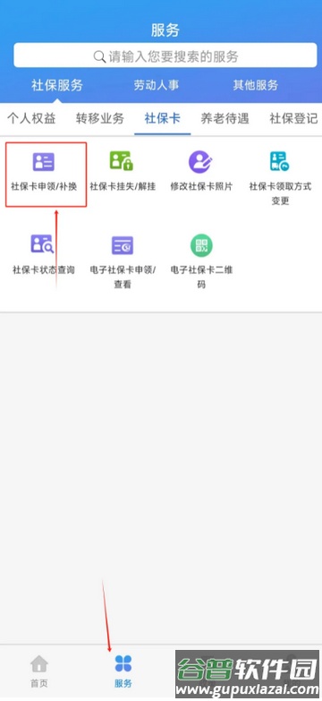 打开天津人力社保手机APP,进入服务菜单,找到社保卡页面,点击社保卡申领或补换功能。
