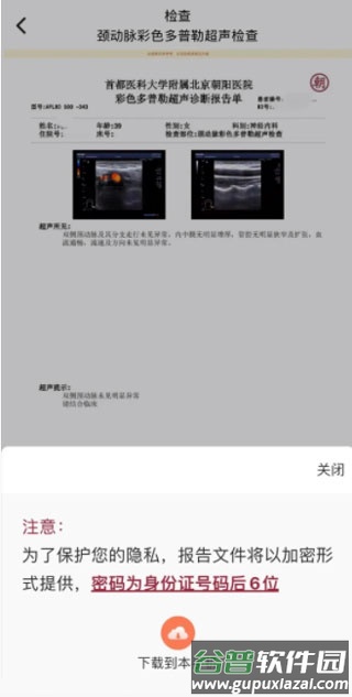 3、点击化验检查可查看报告结果,如需下载至手机,输入身份证后六位即可保存。