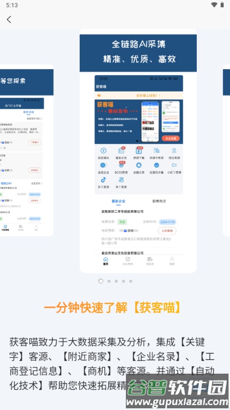 2、快速了解软件,获客喵致力于大数据采集与分析,集成了关键字客源、附近商家、企业名录、工商登记信息及商机等资源,通过自动化技术协助用户拓展精准客源。