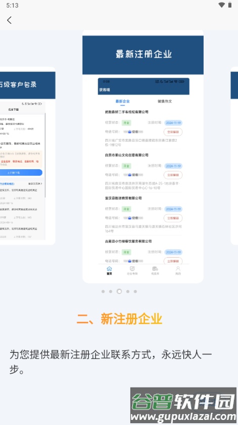 4、新注册企业板块,提供最新注册企业的联系方式,让用户始终领先一步。