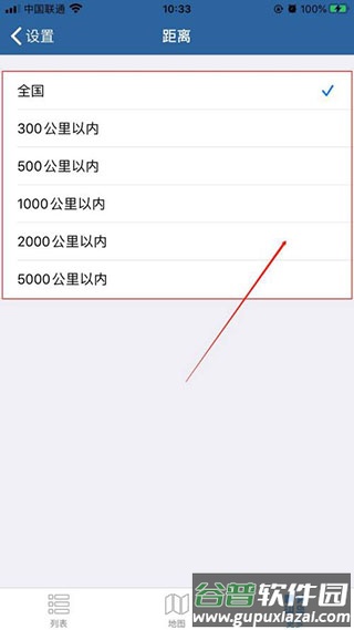 5、在距离设置列表中,根据需求选择“全国”或设定特定的公里范围。