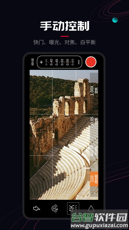 1. 提供专业拍摄功能,支持4K视频录制,并可手动控制曝光、快门、感光度、对焦和白平衡等;