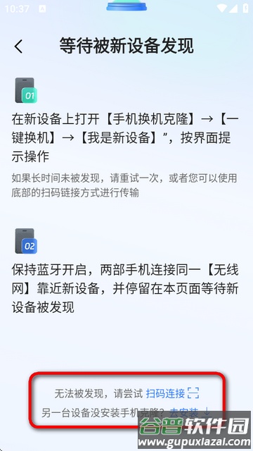 如果长时间未被发现,请重试一次,或者使用底部的扫码连接方式进行传输。