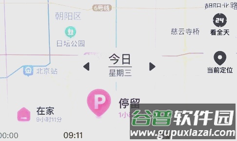 地图上会实时绘制用户的历史轨迹。底部时间块能自动识别停留时长与运动时间,并依此展示全天的行程记录。