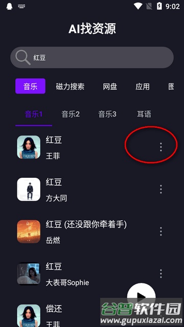 2、搜索结果会显示不同版本的音乐文件,点击右侧的三个点图标。