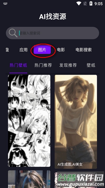 1、打开应用后,在顶部菜单栏中找到并选择图片分类。
