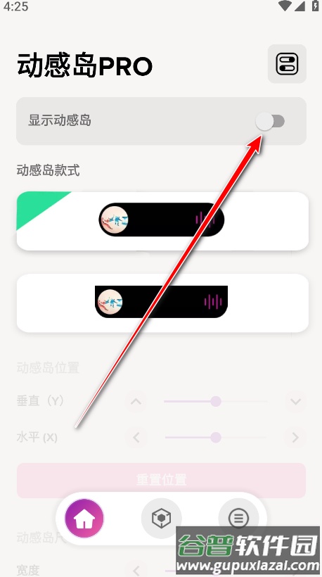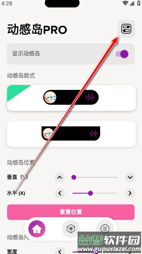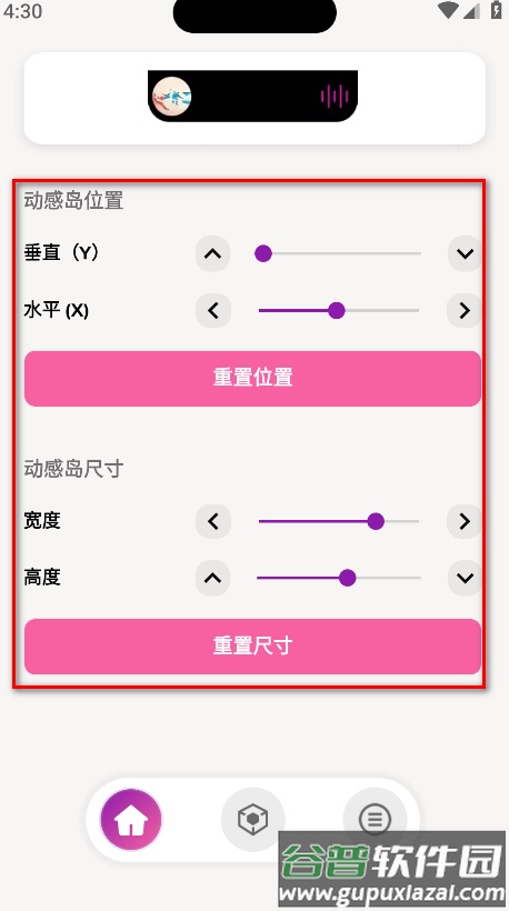 6.回到应用主界面向上滑动,通过左右调节滑杆来改变动感岛的位置与大小;最后可点击重置位置或重置尺寸按钮恢复默认。