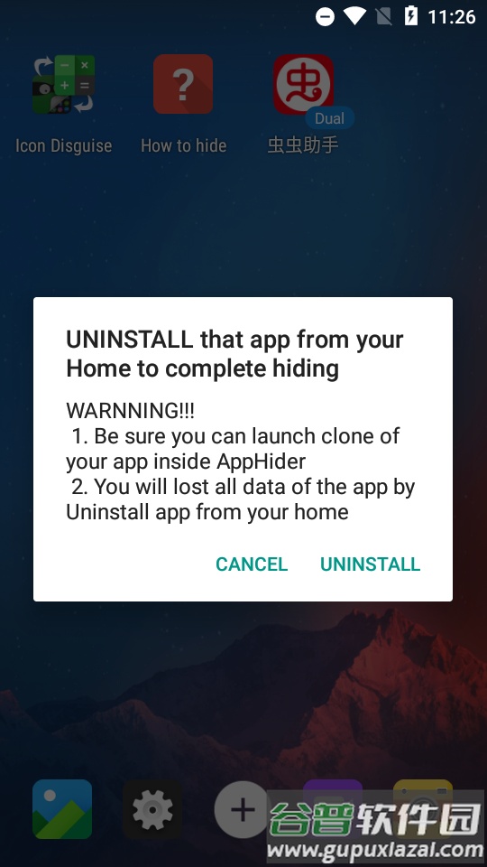 6、选择隐藏功能需等待六秒,界面会出现卸载提示,点击UNINSTALL将移除原始版本,请注意此操作会同时清除该应用的所有数据。