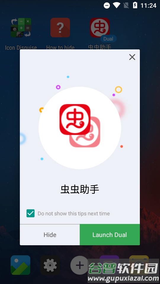 5、随后会弹出选项窗口,点击Launch Dual可实现应用双开;点击Hide则直接隐藏原应用。