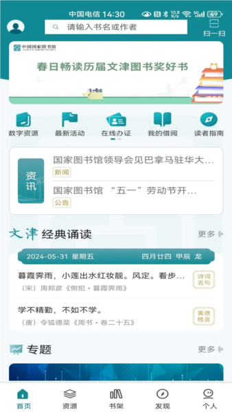实时发布国家图书馆新闻、公告与讲座预告;讲座预告可设置预约提醒;每日上午九点推送一条文津经典诵读诗词名句。