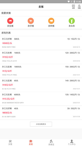 2、养殖户可进入【卖猪】页面查看求购信息,销售分类包括生猪、仔猪、种猪和白条四种类型。