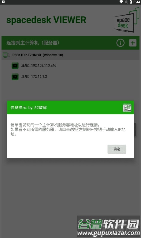 启动软件后,在设备列表中找到主计算机的服务器地址并点击连接;若未发现目标服务器,可点击界面左侧的加号按钮,手动输入正确的IP地址进行添加。