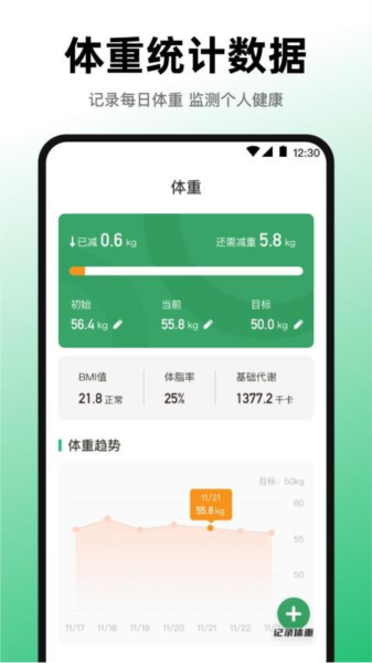 5. 体重趋势记录:长期追踪体重变化,生成可视化趋势图表;
