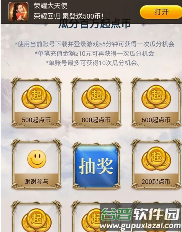 (2)进入活动页面,找到游戏活动专区;选择标注“累计登录送500起点币”的游戏,下载并体验,无需充值。