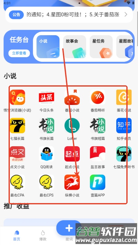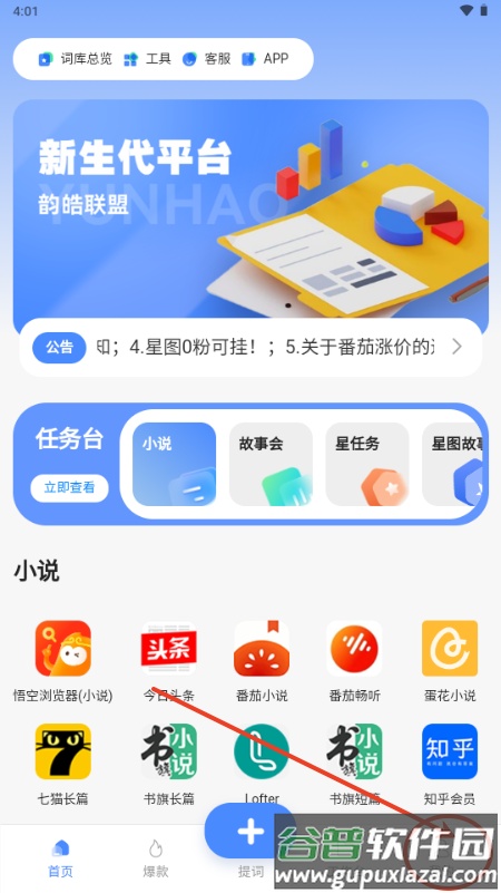 这是一款专为小说推文设计的应用。平台内准备了大量不同类别的小说资源,方便用户选择并推广自己喜欢的故事内容。