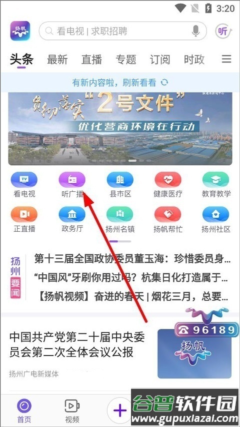 1、打开app,登录进入首页,用户在首页看电视、了解头条新闻、直播新闻、专题阅读等,点击听广播;