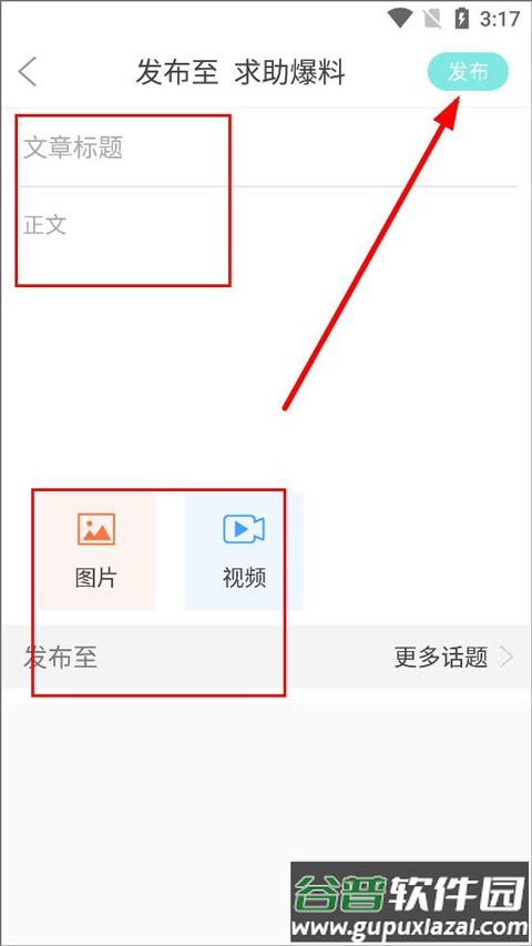 4、进入发布文章页面,用户填写文章标题、正文内容,添加图片或视频,选择发布话题或求助,填写完成后点击右上角发布即可;