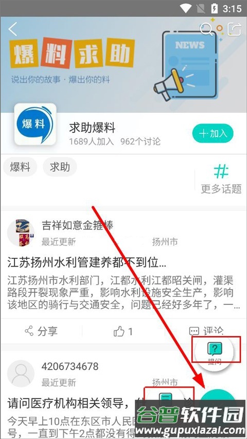 3、进入爆料页面,用户可查看其他用户提出的爆料以及求助内容,点击右侧“+”选择发布文章或提问;