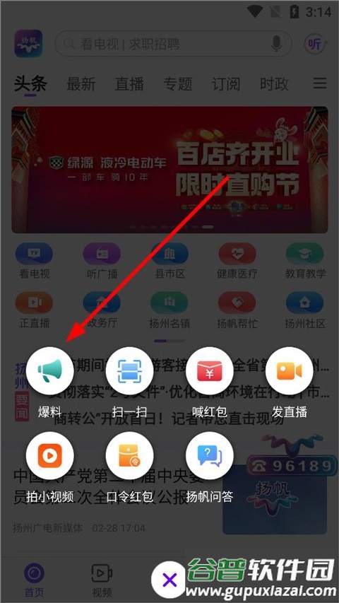 1、打开扬州广电扬帆app官方最新版,登录进入首页,用户可在首页查看头条新闻、看电视、听广播、生活服务等,点击“+”;