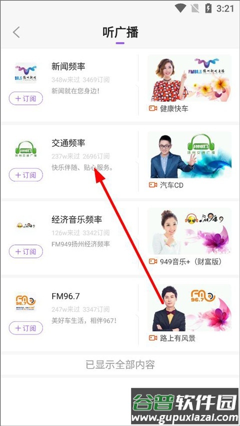 2、进入听广播页面,有新闻频率、交通频率、经济音乐频率等,用户选择自己需要收听的广播;