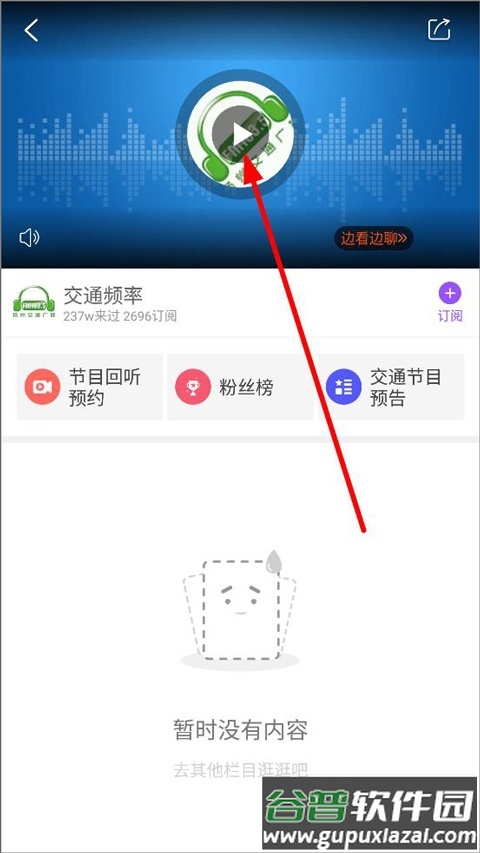 3、打开广播收听页面,用户可订阅广播、节目回听预约、查看粉丝榜和节目预告,点击播放键即可收听广播。
