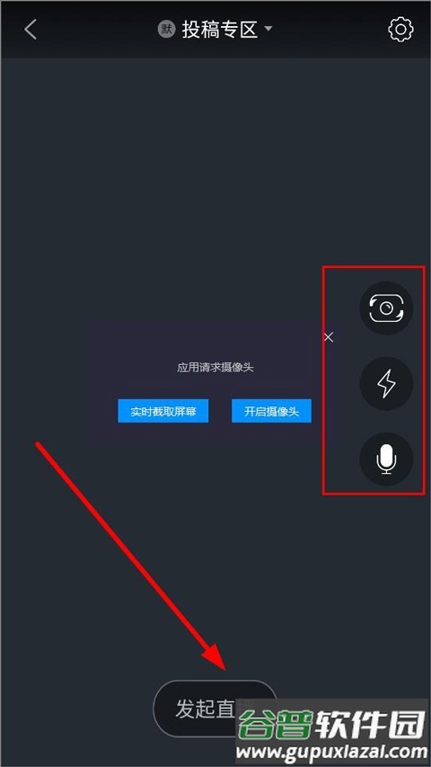 2、开启摄像头,用户可设置镜头、闪光灯和语音,点击发起直播;