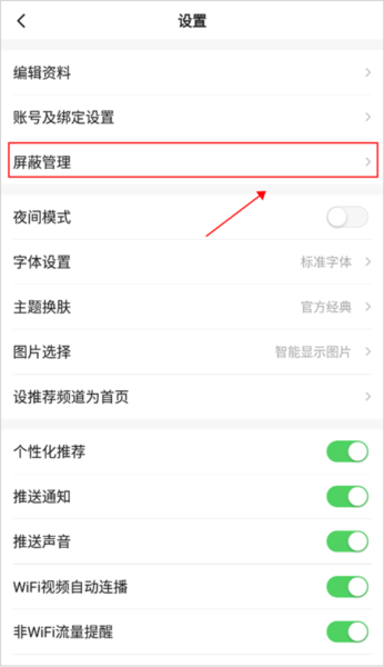 2、在设置列表中,选择“屏蔽管理”功能项。